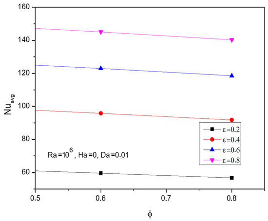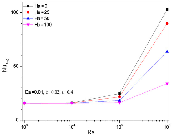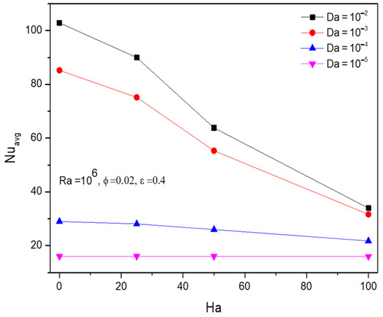 - Vital thermal transmitting rate has been traced in terms of the average Nusselt number (). Hartman number () resists the thermal transferring process by slowing the fluidity, and parameters like Darcy number () and porosity () work in favour of thermal transmitting progress. Interestingly, the nanofluid loading () possesses the switching trend in the Nusselt number () which shows the fluctuating effect that happened after those crucial parametric values around and .