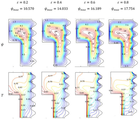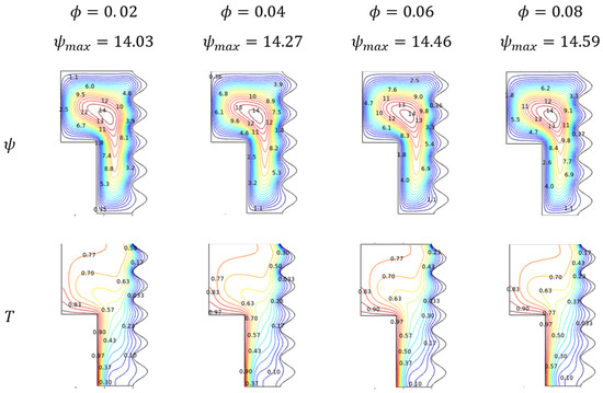 - Even though the thermal transmission process was the hotspot of this study, the porous medium includes the fluidity brought under consideration. Vital sign of improved fluidity was commonly found through the extended flow contour towards the narrow path between two distinct walls. Such a trend can be found as increasing for improving amounts of parameters like Rayleigh (), Darcy () numbers, and porosity (). Moderate contour variation towards fluidity can be viewed through nanofluid loading (), while the Hartman number () plays against it.