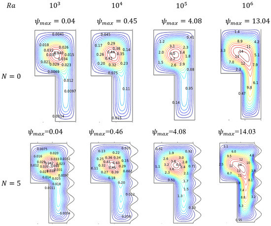 4.1.1. Flow Trends for Rayleigh Number ()