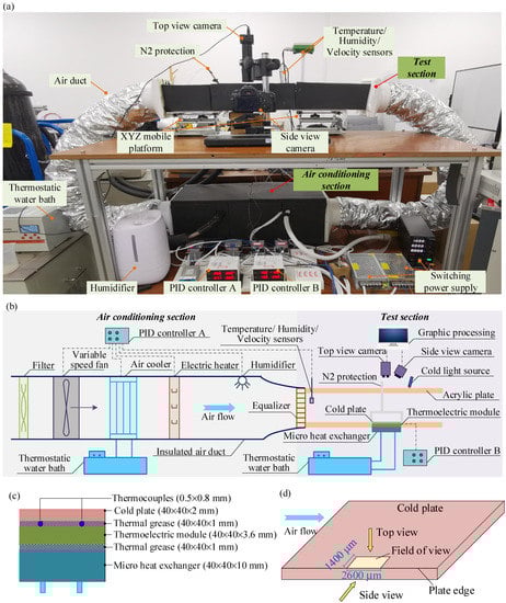A specific experimental set-up was constructed to investigate the localized condensation frosting characteristics in the edge region of a horizontal cold plate. The photograph of the experimental set-up and its schematics are illustrated in Figure 1a,b, respectively. The experimental set-up comprised the air conditioning section and the test section. In the air conditioning section, a constant flow of air with specific temperature, relative humidity, and velocity was processed by a typical air conditioning unit. The air temperature, relative humidity, and velocity were measured by thermocouples (T-TT-36) with an accuracy of ±0.15 °C, humidity sensor (Rotronic HF320) with an accuracy of ±2%, and air velocity sensor (EE650) with an accuracy of ±0.2 m/s, respectively. The air temperature, air relative humidity and air velocity sensors were installed at the inlet of the test section, around 100 mm away from the experimental plate, as illustrated in Figure 1a,b. Using PID controller A, the controlling accuracy of the air temperature, relative humidity, and velocity were ±0.2 °C, ±3.5%, and ±0.2 m/s, respectively. In the test section, the experimental cold plate was horizontally attached to a thermoelectric module and a micro heat exchanger by thermal grease. The dimension of each component is presented in Figure 1c. The static contact angle of the cold plate was 74.6° ± 2.5°. Since the material of the cold plate was copper and its thickness was 2 mm, the difference in temperature between the upper and bottom surfaces of the cold plate was less than 0.1 °C due to little thermal resistance. Therefore, the upper surface temperature of the experimental cold plate could be evaluated by four uniformly distributed superfine thermocouples that were installed at the bottom of the plate. By using PID controller B, the controlling accuracy of the cold plate surface temperature was ±0.2 °C. In general, the air temperature, air relative humidity, air velocity and cold plate temperature could be maintained in the range of 5.0~25.0 °C (±0.2 °C), 30~90% (±3.5%), 0~3 m/s (±0.2 m/s), and −30.0~30.0 °C (±0.2 °C), respectively.