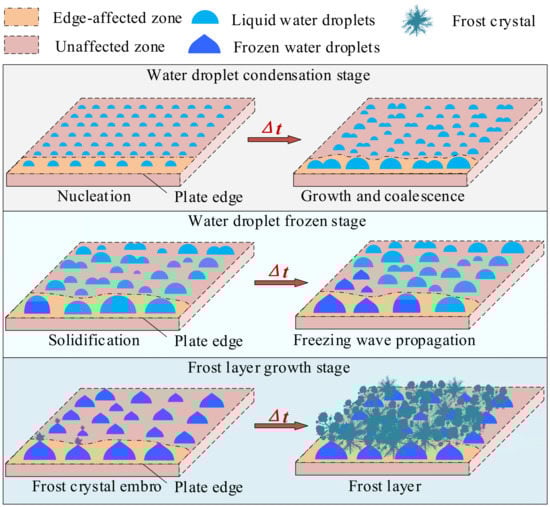 In practical engineering, since the defrosting operation usually begins before frosting enters the final stage, the related studies have mainly focused on the first three stages. The WDC stage characteristics of embryo formation [], droplet growth and coalescence [], jumping [], self-propulsion [], and distribution density [] have been further investigated. The WDF stage begins with the solidification of one of these water droplets on a cold plate. A complete solidification process of a single water droplet includes subcooling, recalescence, freezing, and subcooling stages [,]. Additionally, a notable phenomenon of freezing wave propagation can be observed once one of these droplets solidifies. In 2013, Guadarrama-Cetina first proposed that the freezing wave was mainly propagated by ice bridges, which grew from frozen droplets to liquid droplets []. Apart from ice bridges, frost halo [] and freezing rain [] have also been demonstrated as other types of propagation mechanisms. The velocity of freezing wave propagation among water droplets was much higher than that of the freezing front of a single water droplet. For the FLG stage, numerical and experimental studies on spatial and temporal characteristics of the frost layer, such as frost thickness, density, and surface roughness, were conducted under different frosting conditions [,]. Apart from intelligent models [], most related frosting models required initial frost thickness and density [], which are strongly associated with the characteristic parameters at the end of the WDF stage. In particular, FLG characteristics in the edge region are quite different from those in the interior region []. However, it can be noted that all the published studies on WDC and WDF stages focused on the interior region of cold plates. As a result, the edge effects on WDC and WDF characteristics are still unclear, as well as the relationships among WDC, WDF, and FLG stages in the edge regions of cold plates.