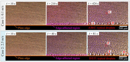 In this study, the WDC stage started when air with high temperature and humidity contacted the cold plate, and the time point was set as 0 s. Figure 3 compares the top-view images of the localized WDC characteristics in the edge region of the experimental cold plate in Cases 1 and 2. As seen, a large number of nanoscale water droplets nucleated on the cold plate surface at the initial WDC stage and kept growing and coalescing as time passed. A similar phenomenon can also be found in many other related studies [,,]. However, water droplet jumping and self-propulsion were not observed in our study, which was different from [] and [], as our experimental cold plate surface was not super-hydrophobic or at a gradient. Additionally, it can be noted that significant differences in water droplet size and distribution characteristics were observed. In general, a single row of water droplets close to the plate edge was much larger and sparser than others, due to the edge effect. Therefore, the region covered by these water droplets was defined as the edge-affected region in this study, as circled by the magenta dash line. The plate edge mainly affected the WDC characteristics through the following three aspects. Firstly, more defects existed in the plate edge, leading to a lower nucleation barrier. Secondly, the plate edge was a joint between the upper and side surfaces of the cold plate, which provided more probability of coalescence of water droplets. Finally, the air side heat and mass transfer rate around the plate edge was much higher due to its geometric singularity. Additionally, it can also be noted that the growth rate of water droplets in Case 2 was much faster than in Case 1 due to the enhanced air side heat and mass transfer rates caused by the air velocity. For example, the water droplets in Case 1 at 210 s were slightly smaller than those in Case 2 at 40 s.