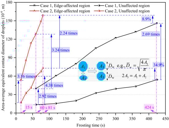 Figure 5 presents the area-average equivalent contact diameter of water droplets in edge-affected and unaffected regions in Cases 1 and 2. As seen, the area-average equivalent contact diameters of water droplets in edge-affected regions were much greater than those in unaffected regions. With respect to Case 1, the area-average equivalent contact diameters of water droplets in edge-affected regions at 60 and 424 s were 39.6 × 10−6 and 146.0 × 10−6 m, which were 2.92 and 2.69 times greater than those in unaffected regions at the same time points, respectively. With respect to Case 2, the area-average equivalent contact diameters of water droplets in edge-affected regions at 15 and 81 s were 53.4 × 10−6 and 164.1 × 10−6 m, which were 3.16 and 2.24 times greater than those in unaffected regions at the same time points, respectively. On the other hand, the area-average equivalent contact diameters of water droplets in Case 2 were notably greater than those in Case 1. For example, the area-average equivalent contact diameters of water droplets in edge-affected and unaffected regions in Case 2 at 60 s were 3.24 and 4.38 times greater than those in Case 1 at the same time. However, the WDC stage duration in Case 1 was notably longer than in Case 2. As a result, the area-average equivalent contact diameters of water droplets in edge-affected and unaffected regions in Case 2 were 8.9% and 34.9% greater than those in Case 1 at the end of their respective WDC stages.