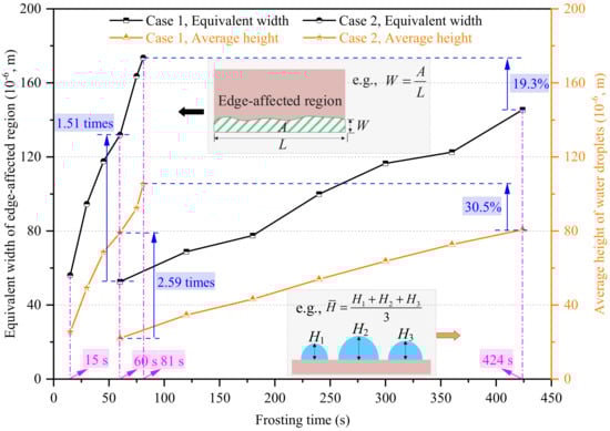 On the other hand, the average height of the water droplets in the edge-affected regions was evaluated by images captured by the side view camera, which was also presented in Figure 7. The variation trend in the average height of the water droplets was similar to the equivalent width of the edge-affected region. In general, the average height of the water droplets in the edge-affected regions consistently increased as time passed. At the end of the WDC stages in Cases 1 and 2, their final values were 80.7 × 10−6 and 105.3 × 10−6 m, respectively. Although the WDC stage duration in Case 1 was 80.9% longer than in Case 2, the final average height of the water droplets in the edge-affected region in Case 1 was 30.5% smaller than in Case 2, due to the lower heat and mass transfer rate. Similar conclusions can also be found in the study carried out by Zhang et al. [].