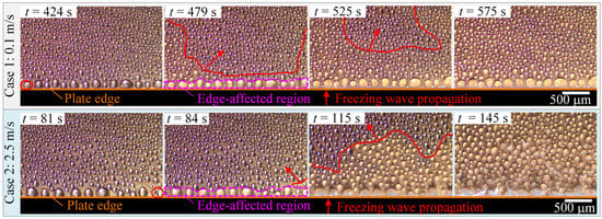 As mentioned in Section 2.3, the WDF stage started when the ice nucleation occurred for the first time. Figure 8 compares the top-view images of the localized WDF characteristics in the edge region of the experimental cold plate in Cases 1 and 2. It was not difficult to distinguish the solidified water droplets from liquid water droplets due to their different refractive index. As seen, ice nucleation firstly occurred at water droplets in the corner of the edge-affected regions. After that, significant water droplet freezing wave propagation was observed, indicated by the irregular red lines and arrows. It was noted that the water droplet freezing wave propagation velocities in edge-affected regions were much faster than those in unaffected regions. As a result, the WDF stage duration in edge-affected regions was much shorter than in unaffected regions. In general, the difference in freezing wave propagation between edge-affected and unaffected regions was mainly caused by the following three reasons. The first was because the contact diameter and coverage ratio of water droplets in edge-affected regions were greater than those in unaffected regions, which decreased the number of times of freezing wave propagation. The second reason was because there existed a secondary freezing propagation path for the water droplets in the edge-affected region, through the water droplets on the side surface of the cold plate. The third reason was because the heat and mass transfer rates in the edge-affected region were much higher than in the unaffected region, which was also the main reason why the freezing wave propagation in Case 2 was much faster than in Case 1. More quantified data on the WDF stage duration, average freezing wave velocity, water droplet size, and distribution characteristics are presented in Figure 9, Figure 10 and Figure 11.