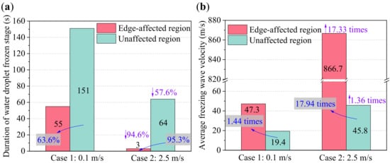 Figure 9a,b providethe WDF stage duration and average freezing wave velocity in edge-affected and unaffected regions, respectively. With respect to Case 1, the WDF stage duration in edge-affected and unaffected regions was 55 and 151 s, respectively. With respect to Case 2, the WDF stage duration in edge-affected and unaffected regions was 3 and 64 s, respectively. Compared with the unaffected region, the WDF stage duration in edge-affected regions decreased by 63.6% in Case 1, and 95.3% in Case 2, respectively. On the other hand, the average freezing wave propagation velocity in edge-affected and unaffected regions in Case 1 was 47.3 × 10−6 and 19.4 × 10−6 m/s, and in Case 2 was 866.7 × 10−6 and 45.8 × 10−6 m/s, respectively. The magnitudes of the average freezing wave propagation velocities in unaffected regions in Cases 1 and 2 were the same as reported in [], from 10 × 10−6 to 100 × 10−6 m/s. However, compared with the unaffected region, the average freezing wave propagation velocities in edge-affected regions increased by 1.44 and 17.94 times in Cases 1 and 2, respectively. In general, both the plate edge and air velocity positively impacted the propagation of the freezing wave at the WDF stage. As a result, it was noted that the WDF stage duration in edge-affected and unaffected regions in Case 2 decreased by 94.6% and 57.6%, respectively, when compared with Case 1. In contrast, the average freezing wave propagation velocity in edge-affected and unaffected regions in Case 2 increased by 17.33 and 1.36 times, respectively.
