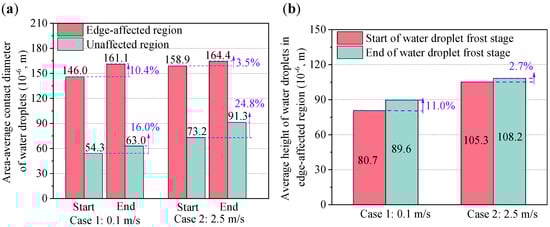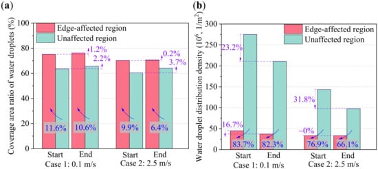 The coverage area ratio and distribution density of water droplets at the start and end of the WDF stages in Cases 1 and 2 are compared in Figure 11a,b. As seen, the coverage area ratios of water droplets in edge-affected and unaffected regions were 76.3% and 65.7% at the end of the WDF stage in Case 1, which increased by 1.2% and 2.2% when compared with those at the start of the WDF stage. For Case 2, the corresponding increase rates in edge-affected and unaffected regions were 0.2% and 3.7%. Additionally, the coverage area ratio of water droplets in edge-affected region was greater than in the unaffected region because the growth rate of water droplets of the former was faster than that of the latter. The coverage area ratio of water droplets in edge-affected regions in Case 1 at the start and end of the WDF stages increased by 11.6% and 10.6%, when compared with those in unaffected regions, respectively. Similarly, the corresponding increase rates were 9.9% and 6.4% in Case 2. The difference in the coverage area ratios of water droplets between edge-affected and unaffected regions decreased as air velocity increased from 0.1 m/s (Case 1) to 2.5 m/s (Case 2).