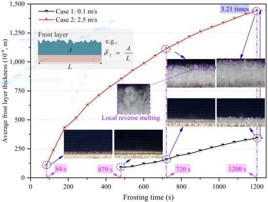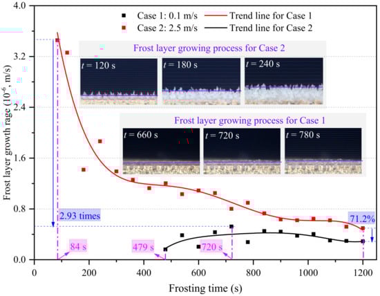 The frost layer growth rate in the edge-affected regions at the FLG stages in Cases 1 and 2 are compared in Figure 13. As seen, the general variation trend in the frost layer growth rate in Case 1 first increased, and then decreased, as time passed, which was similar to the results reported in [,]. At the initial FLG stage in Case 1, the frost layer growth rate was not the maximum, although the frost crystal growth rate later reached the maximum value. The main reason was that many gaps existed among these solidified water droplets, and the frost crystal growth rate in Case 1 was not big enough to balance out these initial gaps. As a result, the average frost layer thickness increased slowly at the initial FLG stage, as demonstrated in Figure 12. The overall frost layer growth rate increased when most initial gaps were filled with frost crystals. At the later FLG stage, the frost layer growth rate decreased as time passed as the surface temperature of the frost layer gradually increased. By contrast, the initial frost crystal growth rate in Case 2 was big enough to balance out the initial gaps among solidified water droplets. Therefore, the frost layer growth rate was maximum at the initial FLG stage and then gradually decreased as time passed. The maximum frost layer growth rate in Case 2 was 3.46 × 10−6 m/s at 84 s, which was 2.93 times larger than the maximum frost layer growth rate of 0.52 × 10−6 m/s in Case 1 at 720 s. Additionally, the frost layer growth rates in edge-affected regions in Cases 1 and 2 were 0.29 × 10−6 and 0.50 × 10−6 m/s at the end of the frosting period, respectively. In other words, the frost layer growth rate increased significantly by 71.2% at 1200 s when the air velocity increased from 0.1 to 2.5 m/s.