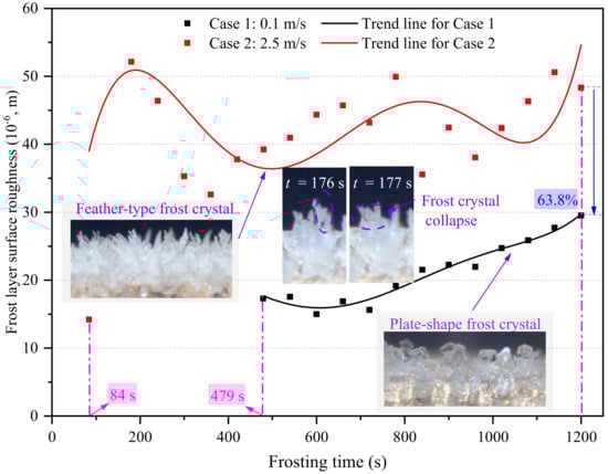 Figure 14 shows the frost layer surface roughness in the edge-affected regions at the FLG stages in Cases 1 and 2. As seen, the surface roughness of the frost layer in Case 2 fluctuated more significantly than in Case 1. One reason for this was that the growth rate of frost crystals in Case 2 was much higher than in Case 1, which may have facilitated the uneven growth of each frost crystal. Another reason was that frost crystal collapse occurred more frequently in Case 2 than in Case 1. As illustrated in the images of Figure 14, frost crystal collapse occurring in the period of 176 to 177 s in Case 1 significantly impacted frost layer surface roughness. Additionally, it was also noted that the frost layer surface roughness in Case 2 was much larger than in Case 1. This was mainly because the frost layer thickness in Case 2 was notably larger than in Case 1. At the FLG stage, frost layer surface roughness increased with an increase in frost layer thickness in general. Additionally, the frost crystal in Case 2 was feather-type, which differed from the plate-type frost crystal in Case 1. Feather-type frost crystals also led to a larger frost layer surface roughness when compared with plate-type frost crystals. The frost layer surface roughness in edge-affected regions in Cases 1 and 2 was 29.5 × 10−6 and 48.3 × 10−6 m/s at the end of the frosting period, respectively. In other words, the frost layer surface roughness increased by 63.8% at 1200 s when the air velocity increased from 0.1 to 2.5 m/s.