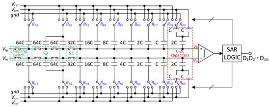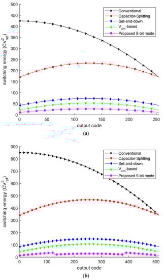In recent years, successive-approximation register (SAR) analogue-to-digital converters (ADCs) have been preferred for biosensor applications [,,,,]. SAR ADC is based on a successive approximation algorithm, which is suitable for designing resolution-reconfigurable SAR ADCs [,,]. Resolution-reconfigurable ADCs can choose the appropriate resolution according to the characteristics of the biomedical signal, thus reducing energy consumption. Recently, several energy-efficient DAC switching schemes have been developed to improve the power efficiency of DAC capacitor arrays [,,]. Compared to a conventional switching scheme [], capacitor splitting [], set and down [], and Vcm-based [] reduce the switching energy by 37.4%, 81.3%, and 87.5%, respectively. However, their switching energy doubles as the number of bits increases by one. Taking the Vcm-based switching scheme as an example, the average switching energy of 8-bit, 9-bit and 10-bit is 42.2 , 84.8 and 170.2 , respectively.