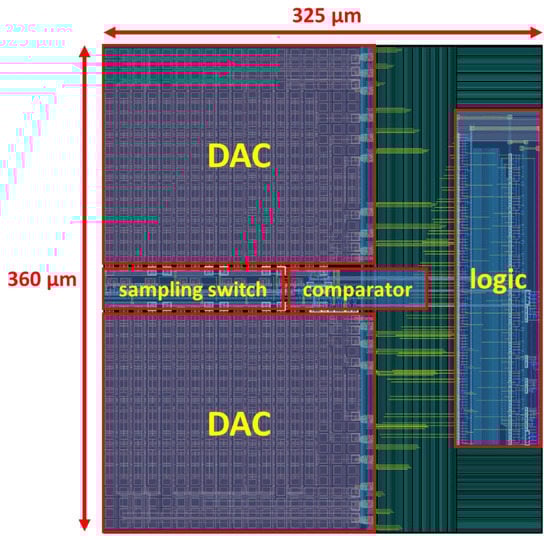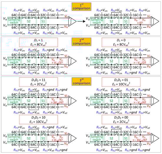From the 5th comparison to the 10th comparison, the DAC performs a Vcm-based switching scheme []. Because the large capacitor does not participate in the first and second comparisons, it is more energy-efficient than a Vcm-based switching scheme.