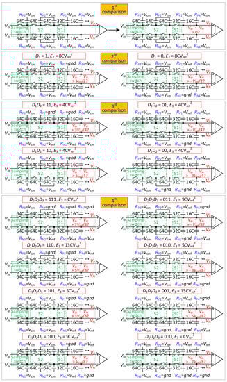 In the 1st comparison, all switches are opened, and the output voltage of the capacitor array is found to be