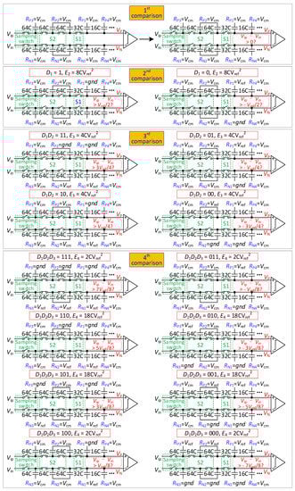 In the 3rd comparison, if D2 is 1, the reference voltage of RP4 is changed from Vcm to gnd, and RN4 is changed from Vcm to Vref. If D4 is 0, the reference voltage of RP4 is changed from Vcm to Vref, and RN4 is changed from Vcm to gnd. The output voltage is found to be