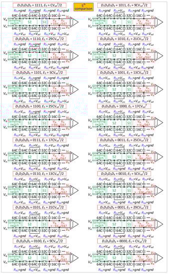 In the 5th comparison, if D4 is 1, the reference voltage of RP4 is changed from Vcm to gnd, and RN4 is changed from Vcm to Vref. If D4 is 0, the reference voltage of RP4 is changed from Vcm to Vref, and RN4 is changed from Vcm to gnd. The output voltage is found to be