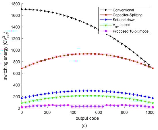 Switching energy against output codes: (a) 8-bit; (b) 9-bit; (c) 10-bit. The black [], red [], blue [], green [] and magenta curves in the three figures are switching energy.