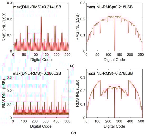 Based on the switching energy calculation method in [], the switching energy of different switching schemes is calculated and shown in Figure 6 and Table 5. Figure 6 shows switching energy at each output code for different switching schemes. Benefiting from the resolution-reconfigurable technology, the proposed switching scheme has lower switching energy in middle output codes for the 9-bit and 10-bit modes. As shown in Table 5 for the proposed switching scheme, the more bits, the more energy is saved; the scheme saves 96.1% and 97.3% of switching energy in 9-bit and 10-bit modes, respectively. Figure 7 presents the 500-run Monte Carlo simulation results of the proposed DAC switching scheme with unit capacitor mismatch of σu/Cu = 2%. The RMS DNL and the RMS INL of the proposed DAC switching scheme are 0.214/0.280/0.488 LSB and 0.218/0.278/0.462 LSB, corresponding to the 8/9/10-bit mode, respectively.
