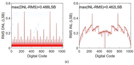 DNL and INL versus output code of the proposed switching scheme: (a) 8-bit mode; (b) 9-bit mode; (c) 10-bit mode.