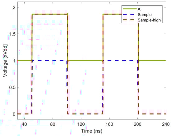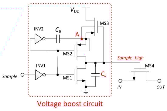In order to reduce the on-resistance of the sampling switch and reduce the sampling error, the sampling switch adopts a bootstrap switch circuit []. The voltage bootstrap sampling circuit is shown in Figure 8. When the “Sample” voltage is low, the transistors MS1 and MS3 are turned on, MS2 and MS4 are turned off, the voltage of node A is charged to VDD, and the “Sample_high” voltage is low. When the “Sample” voltage becomes high, the transistor MS1 is turned off, MS2 is turned on, MS3 is turned off, and MS4 is turned on; the voltage of node A is boosted to 2VDD by the capacitor CB, and the “Sample_high” voltage starts to increase. The “Sample_high” voltage boost expression is as follows: