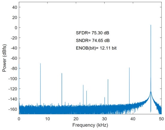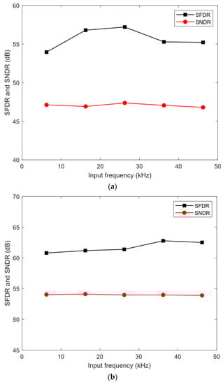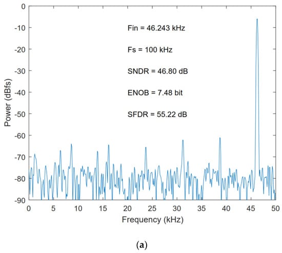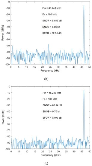 Table 7 compares the proposed ADC with other ADCs [,,,]. As shown in Table 7, the performance of the proposed ADC is still competitive when it is implemented in 0.18 μm 1.8 V CMOS process. The Figure-of-Merit (FoM) was calculated from the following equation: