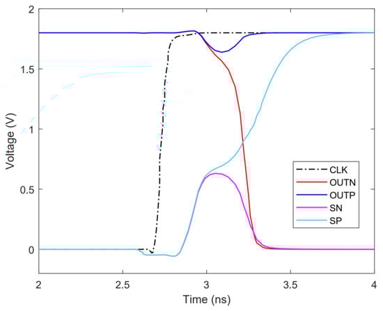 To decrease the power consumption of the comparator, a two-stage full dynamic comparator [] is used. Figure 11 shows the schematic diagram of the comparator. The first stage is the dynamic preamplifier stage, and VP and VN are the output signals of the capacitor array DAC, connected to the differential input of the comparator. AN and AP are differential outputs of the dynamic preamplifier stage. The second stage is the dynamic latch stage, which is responsible for the two-stage amplification and the result latch, and OUTP and OUTN are the comparison results.