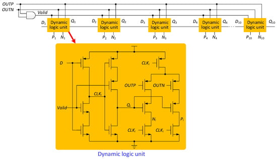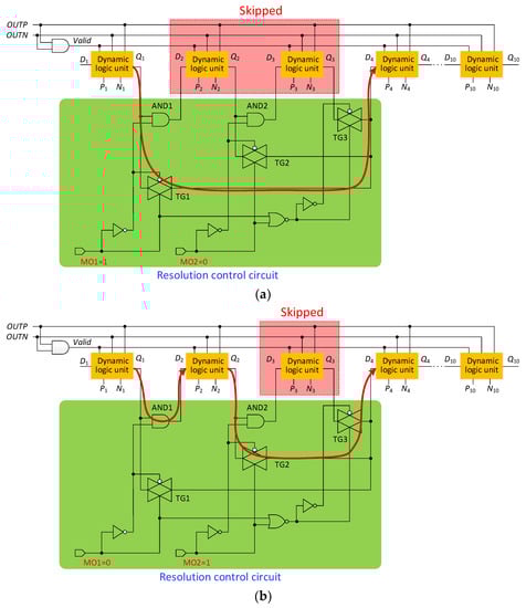 To improve the performance of SAR logic, a dynamic logic unit is used []. As shown in Figure 14, the SAR logic is composed of dynamic logic units, one by one. The dynamic logic unit has both a shift function and a function of storing comparison results, which saves many transistors compared to conventional shift registers. The 10-bit SAR logic has 10 dynamic logic units. When the SAR ADC is operating in 8-bit or 9-bit resolutions, in order to save power, two or one dynamic logic units need to be skipped, respectively. As shown in Figure 15, a resolution control circuit is added to SAR logic. The resolution of SAR logic is controlled by MO1 and MO2. Different resolutions will form different circuit paths. The resolution settings are shown in Table 6.