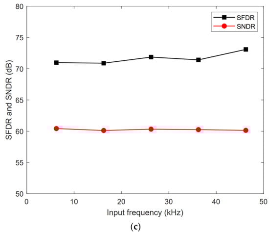 SNDR/SFDR with various input frequencies: (a) 8-bit mode; (b) 9-bit mode; (c) 10-bit mode.