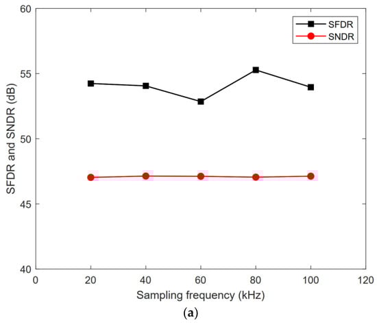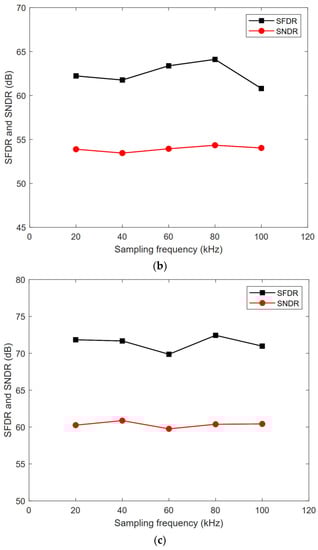 SNDR/SFDR with various sampling frequencies: (a) 8-bit mode; (b) 9-bit mode; (c) 10-bit mode.