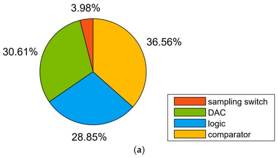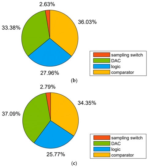 Power breakdown of the ADC: (a) 8-bit mode; (b) 9-bit mode; (c) 10-bit mode.