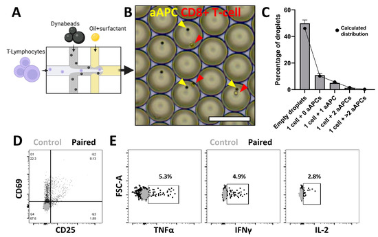 Droplet production was performed using a previously reported pipette tip method [24], and by attaching the droplet device to a neMESYS microfluidic pump (Cetoni, Korbußen, Germany). The first inlet was used for 2.5% Picosurf (Spherefluidics, Cambridge, United Kingdom) in HFE-7500 (30 µL/min), the second for CD8+ T-cells (5 µL/min), and the last for stimuli, or aAPC Dynabeads (Thermofisher) (5 µL/min). Cells were injected at a concentration of 4 × 106 cells/mL. When Dynabeads were included these were injected at a concentration of 1 × 107 particles/mL. Soluble stimuli were added at a concentration of 1 mg/mL for PMA and 10 mg/mL for ionomycin (both from Peprotech). When producing aqueous droplets cells, Dynabeads and stimuli were suspended in culture media, when producing microgels they were suspended in culture media containing 1% w/v of ultra-low melting point agarose (Merck, Kenilworth, NJ, USA). Droplets were collected in Eppendorf tubes and incubated at 37 °C and 5% CO2 for 24 h.