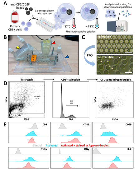 Cytotoxic T-cells (CTLs) are specialized cells that recognize and kill malignant or infected cells, making them the commander-in-chief and the soldiers of the immunological army. The efficiency of these CTLs to find and successfully kill their targets is dependent on the well-coordinated activation of naïve CTLs in the lymph nodes. Only upon encountering antigen-presenting cells (APCs) in the lymph node will they turn into effector CTLs, after which they will return to circulation and actively seek and destroy target cells at sites of inflammation in the tissue. Importantly, a few studies revealed that disease control depends on CTL quality rather than on quantity, where quality was defined by multiple functions [1,2,3]. In line with that, several sub-populations of CTLs were identified based on secreted cytokines and the presence of polarizing cytokines [4,5], suggesting that specific subsets of CTLs are relevant for immunity. Since interrogation of each individual cell is needed to truly identify CTLs of interest, the field has recently moved from conventional bulk experiments to single-cell approaches. Over the past two decades, single-cell technologies have emerged with the goal to dissect cellular heterogeneity and interrogate relevant sub-populations [6,7,8,9,10]. To efficiently and reproducibly probe the heterogeneity upon CTL activation, microfluidic tools were developed to allow precise manipulation and compartmentalization of single cells in small volumes (pico- to nano-liter) [11], thereby providing highly controlled environments acting like bioreactors to efficiently activate CTLs [12,13]. Although these efforts to pair CTLs either with target cells or APCs in microwell- and microtrap-based devices have proven to be effective, they are often restricted by a limited throughput since pairs are captured on-chip and the sample size is thus restricted by the dimensions of the device [12,14]. Droplet-based microfluidics has the major advantage that the sample size can be increased by longer running times thereby yielding higher throughputs [15,16,17,18], which is especially important when one is studying heterogeneity in immune cell responses and rare cell behavior is expected. Previous work aimed at pairing and studying CTL responses in droplets yielded interesting findings at a single-cell resolution [19,20]. However, these studies were often limited to the measurement of only a few parameters through microscopy imaging. As various factors, including both membrane marker expression and cytokine secretion, were previously used to score CTL quality, combining these will allow for true interrogation of the heterogenous CTL response [1,2,3]. To overcome both the challenge of limited throughput as well as allowing measurement in a multiparameter fashion, hydrogels can be incorporated during droplet production to obtain “microgels”, in which cells can be paired. These will maintain the spatial coupling of single-cell pairs while allowing subsequent cell profiling using flow cytometry, facilitating a multiparameter measurement [21]. Hence, microgels could pave the way for novel and robust analytic tools to study single CTL and APC interactions [12,22,23].