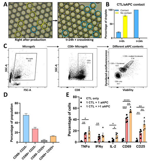 Figure 4. Encapsulation and flow cytometric measurement of CTL/aAPC pairs in microgels. (A) Brightfield microscopy images of droplets for CTL/aAPC pairing; Left image displays droplets directly after production at 37 °C where cells and particles are free floating in agarose solution droplets, right image displays droplets after 24 h of incubation at 37 °C and subsequent gelation at >18 °C where cells are fixed in crosslinked agarose. Yellow circles indicate CTL/aAPC combinations where no contact is observed, blue circles indicate combinations where contact is observed. (B) Results of manual quantification of n = 46 images containing n = 532 CTL/aAPC paired droplets from n = 3 independent experiments. error bars represent n = 3 experiments. (C) Gating strategy of CTL/aAPC droplets; all non-empty microgels are selected, all microgels containing at least a CD8+ cell are gated, based on Dynabead autofluorescence and viability dye intensity gates are drawn for single viable CTLs, 1:1 pairs of CTL/aAPCs, and microgels containing a CTL and multiple aAPCs. (D) Prevalence of populations of 1:1 aAPC activated CTLs based on CD25 and CD69 expression. Data represent SEM of n = 5 biological replicates. (E) Data summary of activation markers in microgels containing only CTLs (blue), microgels containing 1 CTL and 1 aAPC (red), and microgels containing 1 CTL with multiple aAPCs (orange). Data show n = 5 biological replicates with SEM. * p < 0.05, ** p < 0.01, *** p < 0.001, **** p < 0.0001, if no significance is indicated none was found.