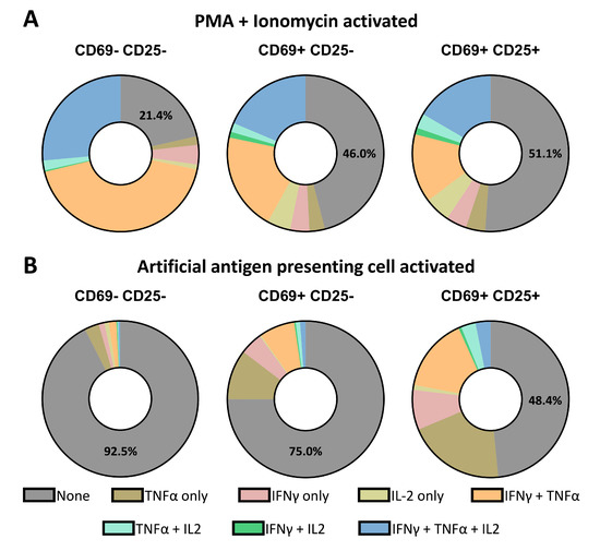 Figure 5. Comparing heterogeneous cell responses between PMA/Ionomycin and aAPC activation. (A) Pie graphs displaying the different profiles of secretion after PMA/Ionomycin stimulation of CTLs, n = 3 donors. (B) Pie graphs displaying the different profiles of secretion after aAPC stimulation of CTLs, n = 5 donors.