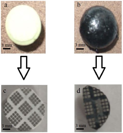 To conduct electrophysical experiments, disks 1 mm thick were cut from the obtained samples, on which contacts were applied (Figure 1c,d).