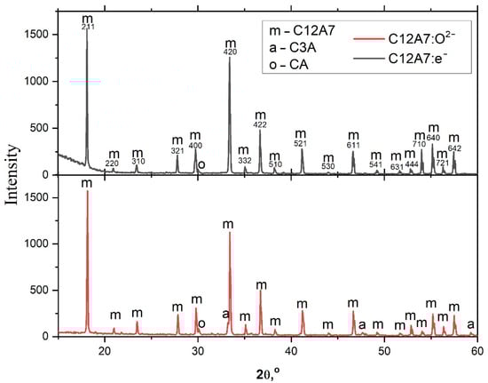 To confirm the phase composition and structure of the obtained material, the samples were analyzed by XRD and electron microscopy. According to the XRD data (Figure 2), the phase composition of the samples corresponds to the expected results. The main phase is mayenite (up to 90–95% of the target phase), presumably containing various anions (mainly O2− in the case of ordinary mayenite and e− in the case of electride). The obtained samples are well crystallized, with crystallite sizes over 150 nm. Insignificant impurities of calcium aluminates Ca3Al2O6 (C3A) and CaAl2O4 (CA) are also observed in the composition of materials. The presence of impurities does not significantly affect the properties under study because these phases are also well crystallized and segregated in local areas of the material volume. A similar phase composition at synthesis temperatures and the stoichiometry of the elements have already been noted earlier in the literature [,]. The unit cell parameter of mayenite C12A7:O2− is smaller (11.998 ± 0.001 Å) than its electride state C12A7:e− (12.004 ± 0.003 Å), which is associated, in the case of an electride, with the formation of oxygen vacancies and weaker interaction electrons with a cationic sublattice, as a result of which the unit cell of the crystal slightly increases [,].