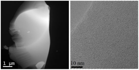 In Figure 3, the particles’ microstructure of the investigated samples of electride C12A7:e− and mayenite C12A7:O2− is presented. The micrograph clearly shows a characteristic cubic crystal lattice with a small number of defects, as well as small formations of an amorphous substance on the particle surface. The particles in the samples have a flat irregular shape, as well as a rather large size (0.5–5 μm).