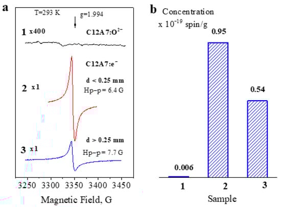 (a) EPR spectra of sample C12A7:O2− (1) and sample C12A7:e− after its grinding in an agate mortar with separation of fractions d < 0.25 mm (2) and d > 0.25 mm (3). (b) Concentration of paramagnetic centers in these samples.