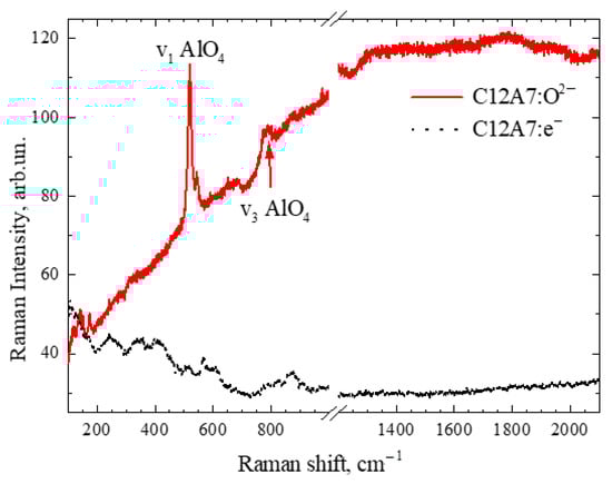 Raman spectra of C12A7:O2− (red) and C12A7:e− (black).