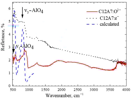 In general, it can be said that the v1–AlO4 (520 cm−1) and v3–AlO4 (780 cm−1) modes, which were observed in the Raman spectra, appear in the reflection spectra. Similar features were also observed in the absorption and transmission spectra of the infrared radiation in mayenites [,,]. In addition, in the experimental spectra of both samples, there were features with a frequency between 1000 and 1500 cm−1. This may be a contribution from the vertical vibrations of Al–O [] (Al–O vertical vibrations). The features observed in the spectrum of mayenite with a frequency of more than 3600 cm−1 may be due to the contribution of O–H vibrations [].