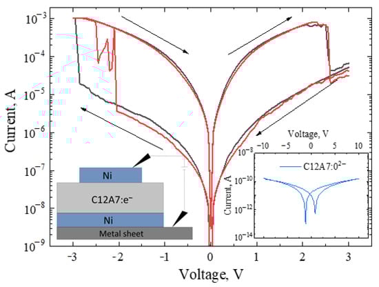 Figure 7 shows the current–voltage characteristics (I–V curves) of electride C12A7:e−. The initial sweep voltage for the electride was 3 V. From 3 V to −3 V, the state of the HRS (lower branch of the I–V curve characteristic) was recorded during the sweep. The switching voltage from the HRS to the LRS (turn on) varied from −2 V to −3 V. After reaching the switching point, the state was transferred to an LRS, and the LRS is observed in the reverse direction of the sweep. The switching voltage from the LRS to the HRS was 2.5 V. Monocrystalline and polycrystalline C12A7:e− are characterized by several resistive states [,]. This phenomenon is called the memristor effect and indicates the prospects for using mayenite-type electride as the main dielectric in ReRAM devices []. The I–V curve for oxygen-containing mayenite C12A7:O2− is shown in the inset in Figure 7, and the measurement range was from 10 to −10 V. According to the obtained dependence of current on voltage, in the normal state, mayenite does not have memristor properties.