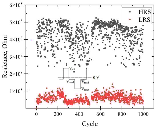 Figure 8 shows 1000 cycles of electrode re-cycling. The reading voltage was −1.5 V. The cycle time was 100 ms. The switching pulse time was 10 ms. Vset/Vreset was +5/−5 V, respectively. The cycle measurement scheme is shown in Figure 3. When looking at Figure 8, two states can be distinguished, which were kept for 1000 cycles.