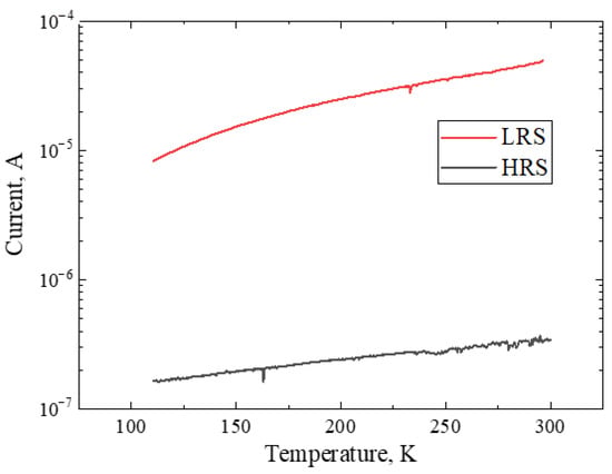 Figure 9 shows a general view of the temperature dependences of the conductivity of the C12A7:e− sample in the HRS and LRS states. The read voltage for the current readout was 0.5 V. The behavior of the current in the HRS state when the temperature change had a similar trend with the behavior of the current in the LRS state, i.e., the current increased as the temperature increased. The decrease in conductivity with decreasing temperature indicates a semiconductor type of conductivity. However, monocrystalline electride has mainly metallic conductivity [,]. This can mean that there are two types of anions in the C12A7:e− sample, i.e., oxygen ions O2− and electrons e−. Based on this, we can conclude that in the electrode, to create the possibility of resistive switching, it is sufficient to partially replace the O2− anions with e− electrons.