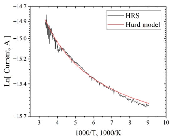 Dependence of current on temperature for the HRS state (black) and approximation curve by the Hurd model (red) for C12A7:e−.