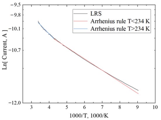 Dependence of current on temperature for the LRS state (black) and two approximation curves (before 234 K red and after 234 K blue) by the Arrhenius model.