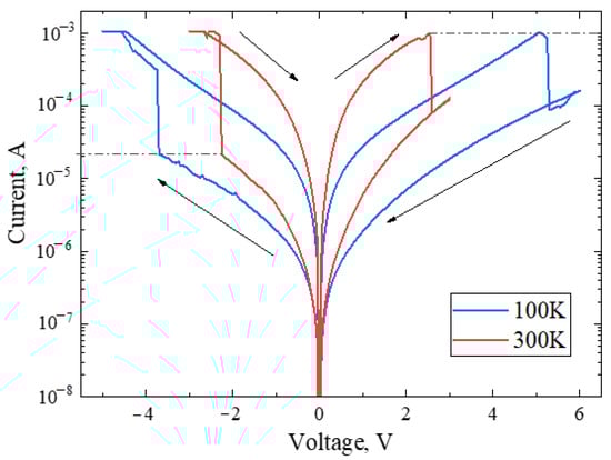 I–V curve characteristics at the extreme points of measurement at 100 and 300 K are shown in Figure 12. From the analysis of the curves, we can conclude that with a decrease in temperature by 200 K, both the ON and OFF voltage (i.e., biases required for the transition to LRS and HRS states, correspondingly) increased by 2–3 V, while the current at the moment of switching remained the same. Probably, switching between resistive states depends on local heating in regions where the concentration of anion–electrons in mayenite is higher.