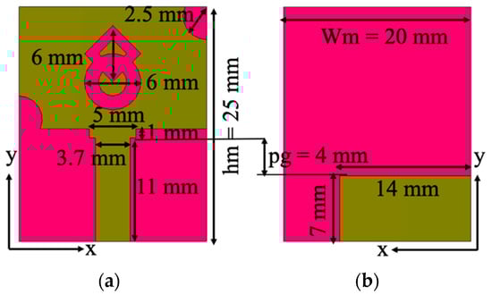 Figure 1 displays the unit cell layout of the proposed antenna. The unit cell is designed on the polyester substrate with dielectric constant and loss tangents of 1.9 and 0.045, respectively []. Polyester is chosen as the substrate material because of its durability, lightweight, wrinkle resistance, strain resistance, and shape retention properties. The unit cell occupies a volume of 25 mm × 20 mm × 1.5 mm (0.25 × 0.2 × 0.015), where is equivalent to the lowest operating frequency. The proposed antenna operates in the UWB range (3.1–12 GHz), and a partial ground plane is used to achieve better impedance matching.