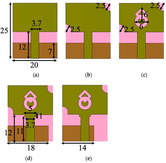 Evolution stages of the proposed antenna. (a) Evolution-1, (b) Evolution-2, (c) Evolution-3, (d) Evolution-4, and (e) Evolution-5.