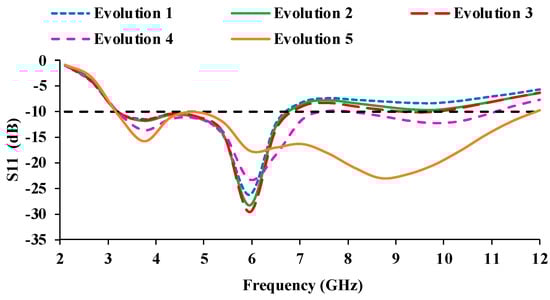 Figure 2a portrays a rectangular radiator with a modified ground plane (Evolution 1). In the next stage (Evolution 2), a combination of circular and square rings is loaded in the center of the radiator (Figure 2b). In the third stage (Evolution 3), the corners of the radiator are truncated with symmetric semi-circular slots, which improves the impedance matching. It has a frequency range of 3.1–6.5 GHz (with an impedance bandwidth of 3.4 GHz) and 9–9.8 GHz. In the fourth stage (Evolution 4), the ground plane size is reduced by 2 mm from the top edge, and 4 mm from the side edge near the feedline, as shown in Figure 2d, resulting in an impedance bandwidth coverage of 3.1–7.1 GHz and 8.1–10.8 GHz. Additionally, the feedline is modified to a step-shaped geometry to improve impedance matching. The ground plane is further truncated (6 mm) from the edge to increase operational bandwidth (Evolution 5), as shown in Figure 2e, resulting in a wider bandwidth of 8.9 GHz (3.1–12 GHz). Figure 3 shows the reflection coefficient curves of the evolution stages. The antenna operates at frequencies ranging from 3.1 to 12 GHz.
