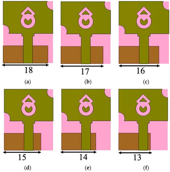 Parametric analysis of the antenna with varying ground plane width (GW). (a) GW = 18 mm, (b) GW = 17 mm, (c) GW = 16 mm, (d) GW = 15 mm, (e) 14 mm, (f) 13 mm.