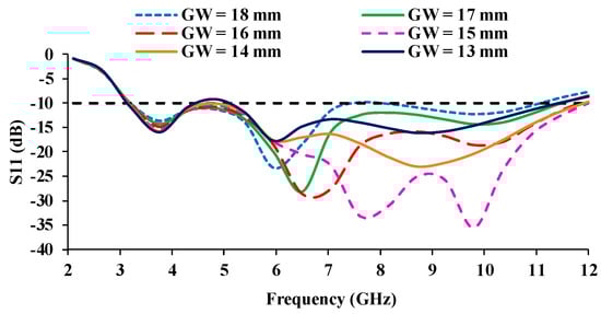 The performance analysis is carried out by varying the ground plane width (GW) from 18 mm to 13 mm, as shown in Figure 4, and the corresponding S-parameters are shown in Figure 5. At GW = 18 mm, the entire UWB range is not covered, as there is some impedance mismatch in the frequency range of 7.3–8.2 GHz. When the GW is reduced to 17 mm, the proposed antenna covers UWB frequencies from 3.1 GHz to 10.6 GHz with an impedance bandwidth of 7.5 GHz. When the GW is reduced further, from GW = 16 mm to 14 mm, the impedance bandwidth on the higher frequency side increases, resulting in a larger impedance bandwidth of 8.9 GHz (3.1–12 GHz). When the ground plane width is reduced to 13 mm, the impedance begins to degrade in the 4.2–5.3 GHz frequency range. Therefore, the ground plane truncation is kept as 14 mm to achieve an impedance bandwidth of 8.9 GHz.