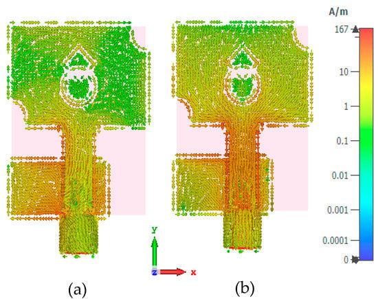 Current distribution at (a) 4 GHz, (b) 10 GHz.